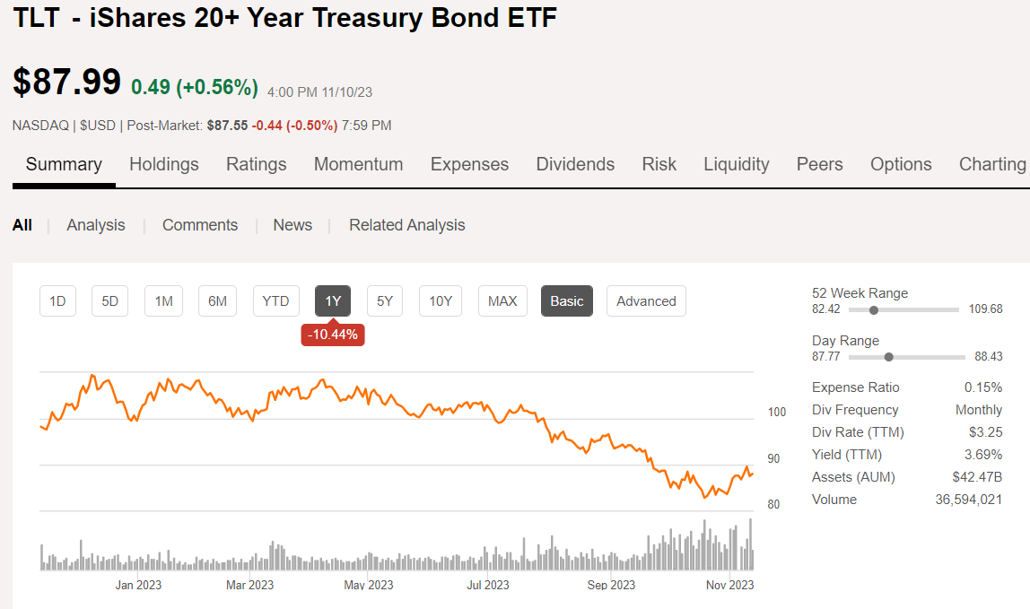 2023년 10월, TLT는 990억 달러라는 엄청난 거래량을 기록했습니다. 특히, 최근 가격이 급격히 회복되면서 장기 채권의 가격과 금리 관계에 대한 일반적인 이해에 의문을 제기하고 있습니다. 장기 채권의 가격은 해당 채권의 금리가 하락할 때 상승하며, 그 반대의 경우도 마찬가지입니다.